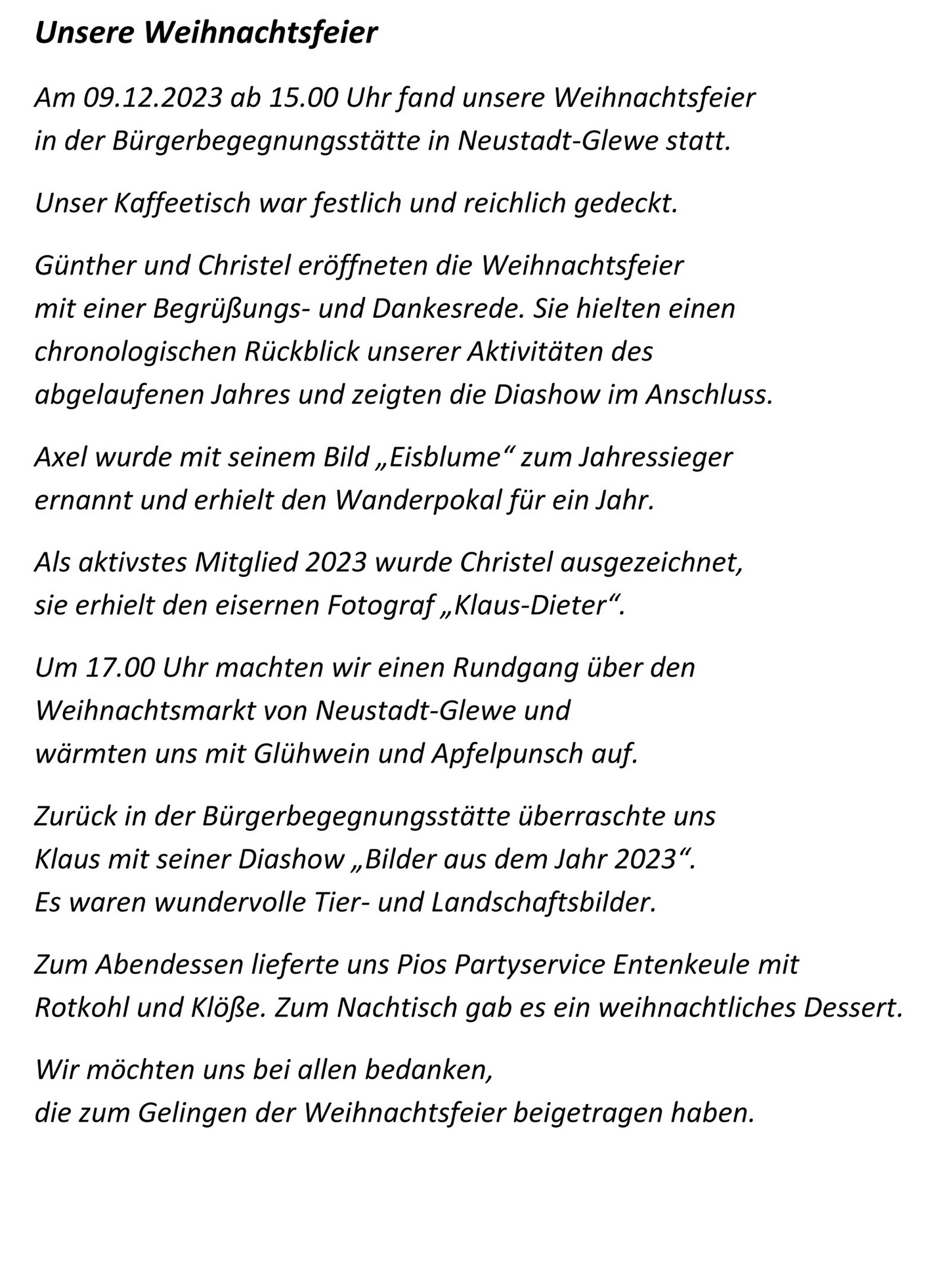 Weihnachtsfeier mit einer Begrüßungs- und Dankesrede. Sie hielten einen chronologischen